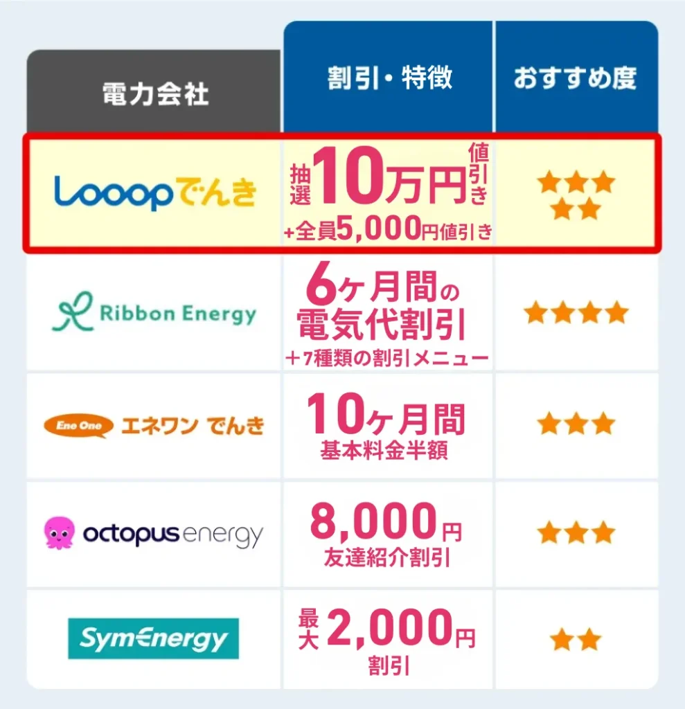 | サービス名 | ![]() Looopでんき | リボンエナジー | エネワン でんき | ![]() オクトパスエナジー | ![]() SymEnergy |
