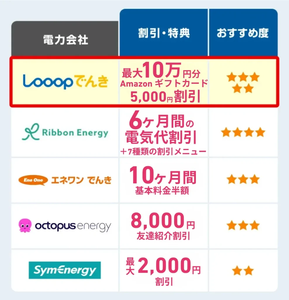 今回、TVやSNSなどで注目を集めている人気の電力会社を比較し、最もお得になるであろう特典の順にピックアップしました!ぜひチェックしてみてください!